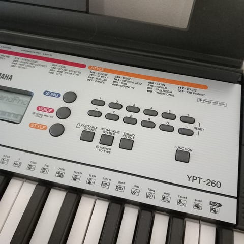 Yamaha PSR-295 on 61-koskettiminen kosketinsoitin. Soittimessa on sisäänrakennetut kaiuttimet, LCD-näyttö sekä useita toimintonäppäimiä eri ääni- ja säestysasetuksia varten. Väriltään soitin on hopea. Kuvissa näkyy lisäksi musta On-Stage Stands -merkkinen teline, joka on säädettävä.