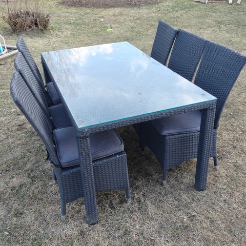 Neljän hengen pöytäryhmä (Veken Honka-Pyry) ulkokäyttöön esim. terassille. Pöytä mäntyä, tuolit rottinkityyppiset. Pientä kulumaa pöydässä (kuvat) ja pinttymää tuoleissa. Tuoleihin saa halutessaan mukaan beiget istuintyynyt (nämä vielä varastossa, ei kuvaa tähän hetkeen).