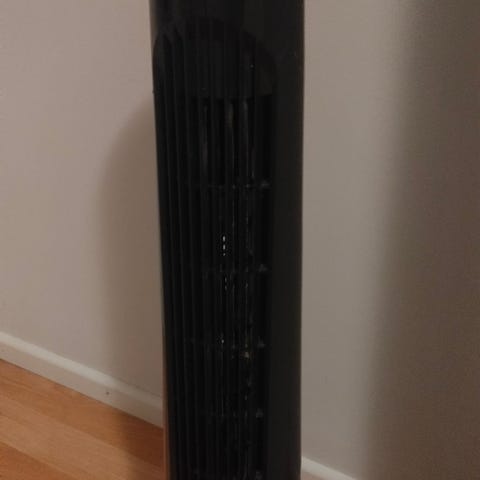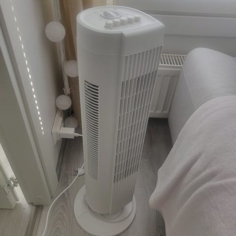 Toimiva tornituuletin lämpötilanäytöllä ja kaukosäätimellä.