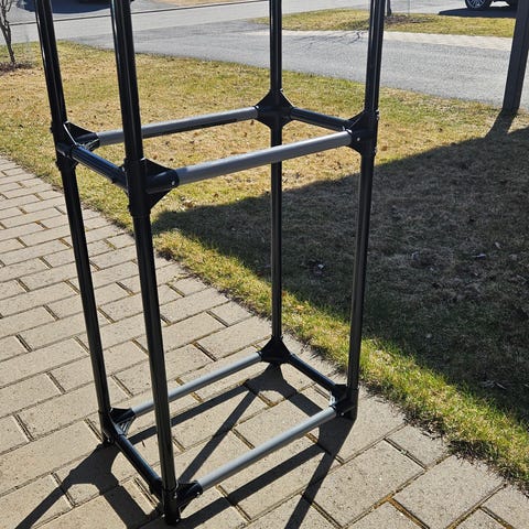 Syksyllä 2025 ostettu ja uusia renkaita pusseissaan säilytetty talvikauden ajan. Kunto uutta vastaava. Tässä säästyt telineen rakentamisen vaivalta. Renkaat menivät rengashotelliin, niin tälle ei ole enää tarvetta.