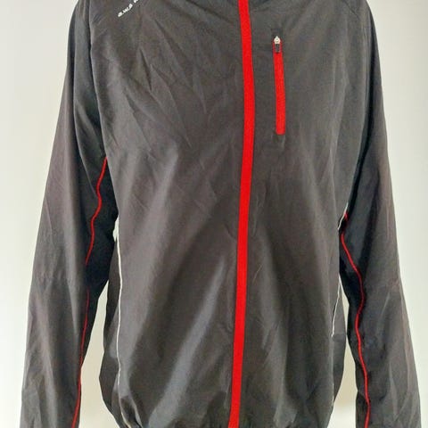 Verkkapukumaista kangasta oleva pyöräilytakki. Selässä muutama "pintanaarmu langan repsotus", muutoin ehjä.