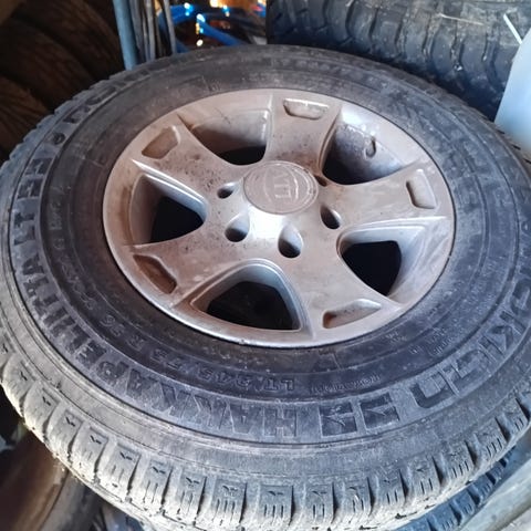 Tosi hyvät renkaat Mazdan vanteilla. Iso keskireikä, käy varmaan kaikkiin takaveto pakuihin/lava-autoihin