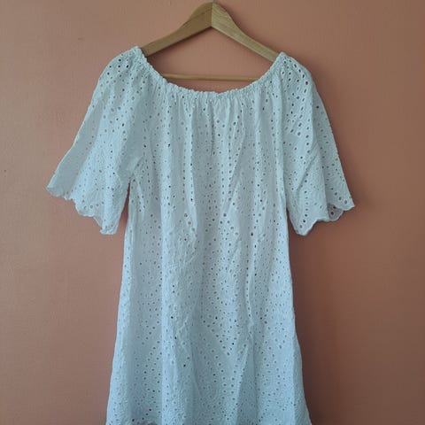 Valkoinen, kevyt, boheemi pitsimekko erillisellä alushameella. Mekossa ei ole kokomerkintää, mutta arvioin kooksi vähintään 42 - vaate on joustava. Mekossa ei myöskään ole materiaalimerkintää, mutta alushame on 95% viskoosia ja 5% elastaania.