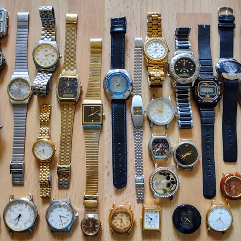 Kuolinpesästä laatikollinen sekalaisia kelloja
