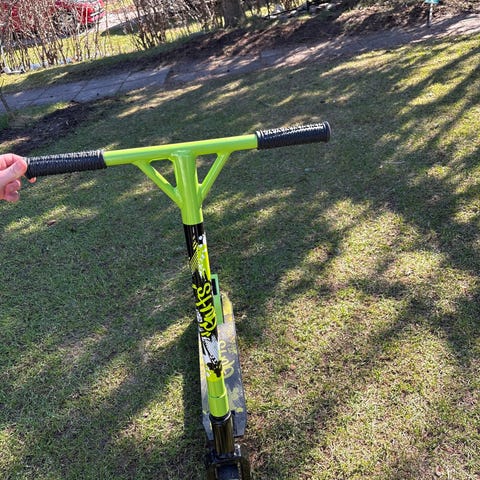Potkulauta, jossa vihreä ja musta runko. Kaksi potkulautaa kuvassa, molemmissa pienet renkaat ja matala dekki. Soveltuu potkutteluun tasaisilla alustoilla, kuten pihoilla ja kevyen liikenteen väylillä. Materiaali todennäköisesti metallia ja muovia. Tarkemmat mitat ja tekniset tiedot eivät käy ilmi kuvasta. Hinta on yhdelle