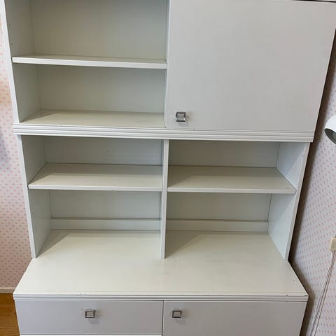 Valkea ylöspäin syvyydeltääm kapeneva hylly. Siistissä kunnossa, yhdessä hyllyssä pientä värjäymää.