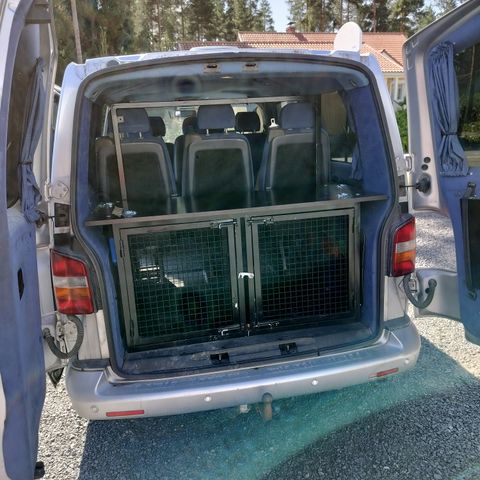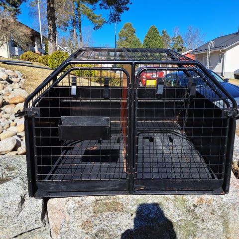 Väliseinän saa poistettua. Ollut saksanpaimenkoirien käytössä ja hyvin mahtuu isompikin kaveri sinne.