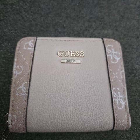 Guess naisten lompakko tekonahkaa. Lompakossa on viininpunainen läppä ja kuviollinen beige-punainen alaosa, metallinen Guess-solki edessä sekä useita korttipaikkoja ja lokeroita seteleille ja kuiteille. Sopii naisten käyttöön arkilompakkona.