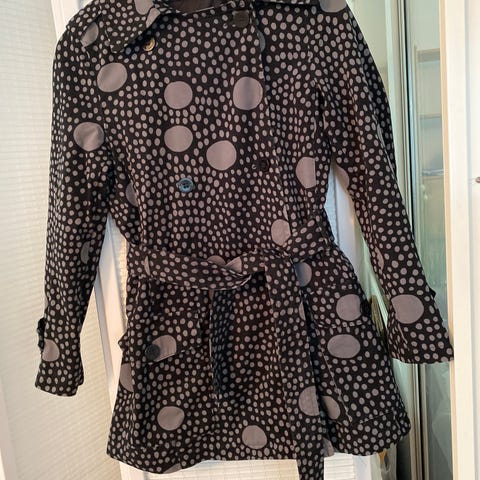 Marimekko naisten mekko, arvioitu koko S. Musta puuvillainen mekko, jossa vaalea pallokuvio. Pitkät hihat ja pyöreä pääntie. Edessä paikkataskut.