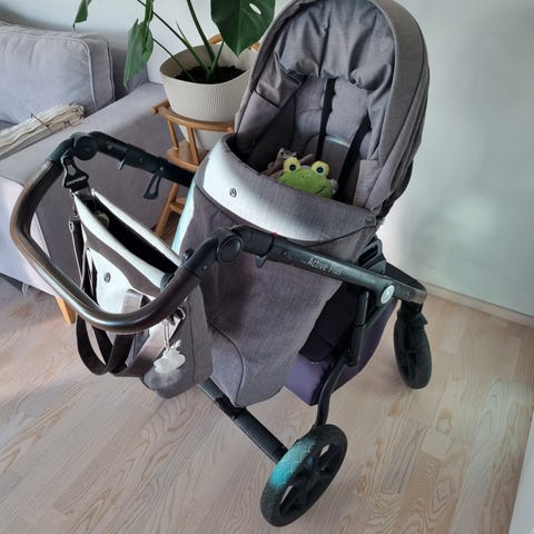 Mukana sadesuoja, hyönteissuoja, hoitolaukku ja sen sisällä hoitoalusta, adapterit jotka sopii ainakin Joien turvakaukaloihin mutta mahdollisesti myös muihin. Etupyörät on lukittavat. Säilytetty aina lämpimässä varastossa tai sisällä.