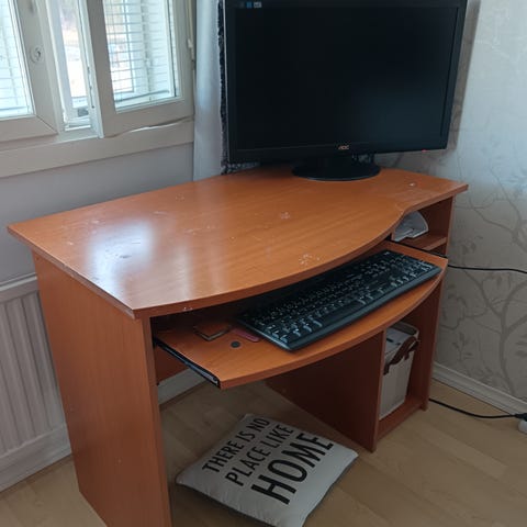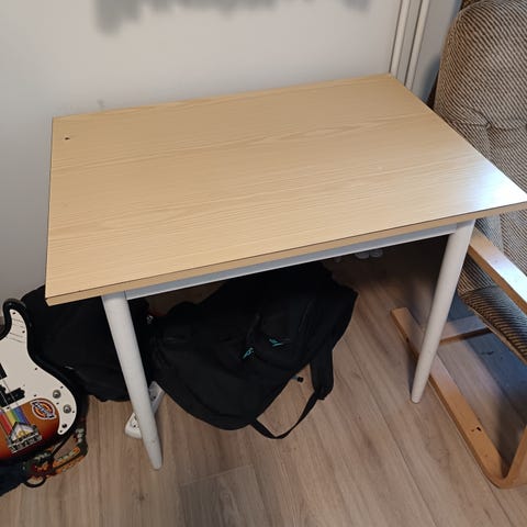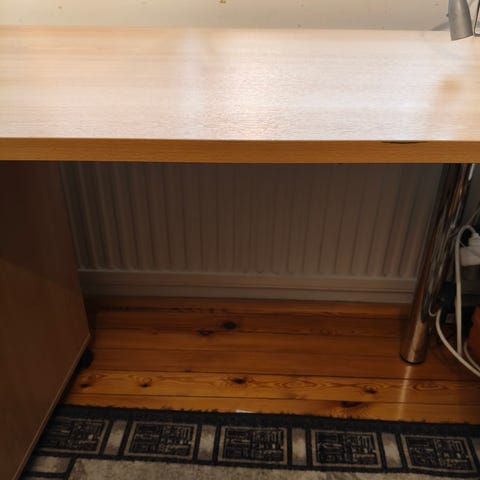 Annetaan työpöydän kansi ja jalka pöydän toiseen päätyyn. Pöytälevy on melko sotkuinen, mutta suurimman osan jäljistä ja teippijämistä saa varmasti puhdistettua.