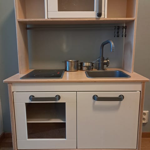 Siistissä kunnossa oleva puinen punainen leikkikeittiö, valot toimii, ei juurikaan käytönjälkiä. Leveys 70cm, korkeus 104cm, syvyys 38cm. Vain nouto Sankilasta