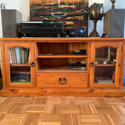 Iso ja massiivinen Askosta ostettu senkki. Sisällä hyllytaso molemmissa kaapeissa, sekä vetolaatikko. Pinnassa hieman elämän jälkiä, lähinnä päällä, ovessa lähes huomaamaton juova. Muuten siisti.