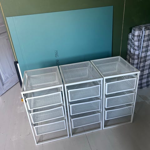 Varastohyllyjä 3kpl. Metalli-runko, lastulevyhyllyt. Tarpeettomana. Osina, kasaamiseen ei tarvitse työkaluja. Jos haluat kiinnittää ne toisiinsa, tarvitset pienet pultit ja mutterit.