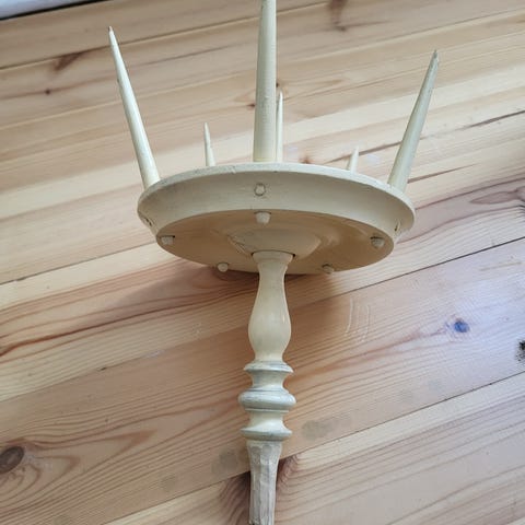 Esine koostuu pyöreästä puulevystä, jossa on pystysuorat tapit pellavan pitämiseksi paikallaan.
