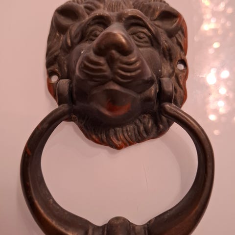 Metallinen koristeellinen ovikolkutin, jossa suorakaiteen muotoinen taustalevy.