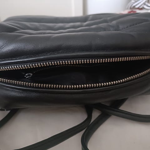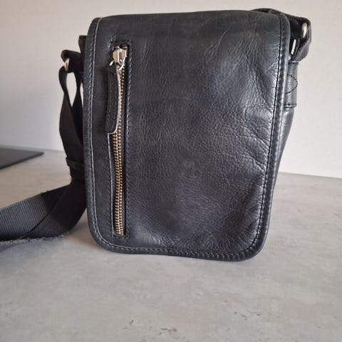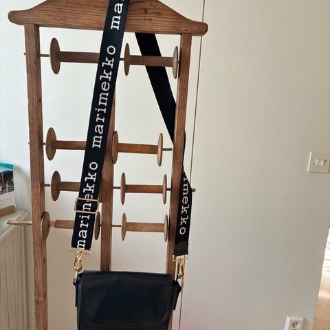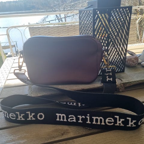 Marimekko nahkainen olkalaukku naisille. Laukku on mustaa nahkaa ja siinä on irrotettava, säädettävä leveä olkahihna, jossa on Marimekko-logo. Laukussa on vetoketjusuljenta ja hopeansävyiset metalliosat. Muoto on suorakulmainen ja kompakti, sopien esimerkiksi lompakon, puhelimen ja pienten henkilökohtaisten tavaroiden kuljettamiseen arjessa. Hoidettu nahkahoitoaineella.