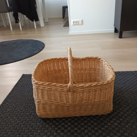Tukeva metsllilankainen kori puukahvoilla. Halk. 58/45cm, Kork. 39,5 cm
