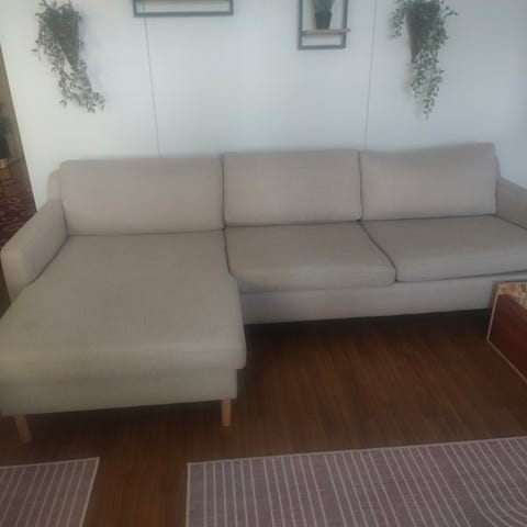 Hyväkuntoinen ja siisti harmaa divaanisohva, ei paljon uudelle häpeä. Kätisyys vaihdettavissa, irrotettavat istuintyynyt käännettävissä.