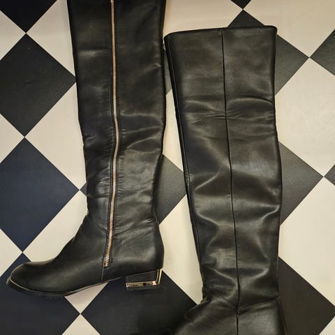 Kuvan hyväkuntoiset saappaat, ei näy lappuja mitä materiaalia on mutta luulisin olevan aitoa nahkaa, ei ole säilytyksessä menneet huonoksi. Harmaan kulutetun näköistä pinta. Korko 7cm. Varren pituus 41cm ja yläreunan ympärys 38cm yläsosan kuminauha vähän antaa periksi lisää.