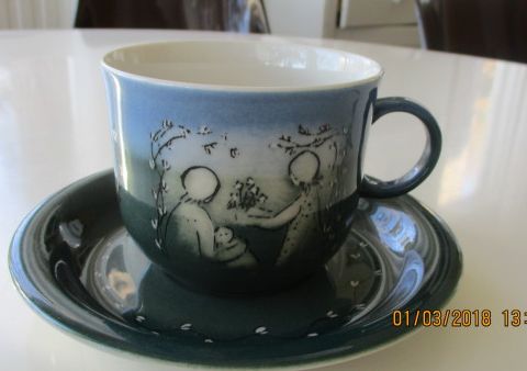 Kuppi ja lautanen joita vuosikymmeniä säilytetty vitriinissä, eivät ole käytössä olleet, ei lohkeamia.