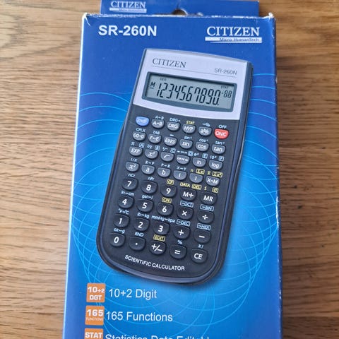 Citizen SR-260N tieteislaskin. Laskimessa on monirivinen näyttö ja laaja valikoima funktioita muun muassa peruslaskuihin, tieteellisiin laskuihin, trigonometriaan ja tilastolaskentaan. Mukana irrotettava suojakansi, joka suojaa näppäimistöä ja näyttöä kuljetuksen aikana. Soveltuu esimerkiksi koulu- ja opiskelukäyttöön, jossa tarvitaan tieteislaskimen toimintoja.
