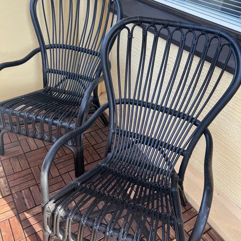 Rottinkituolit, joissa valkoinen puurunko ja harmaa rottinkipunos selkänojassa ja istuimessa. Sopivat esimerkiksi ruokapöydän tai terassin tuoleiksi. Tuolit soveltuvat sisä- tai katettuun ulkokäyttöön. Säilytetty talvet lämpimässä varastossa ja kesällä katetulla terassilla.