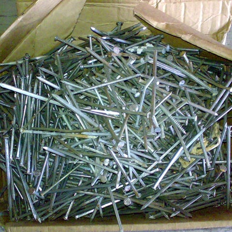 Erä ruuveja,nauloja ja itse tehdyt puiset laatikot.