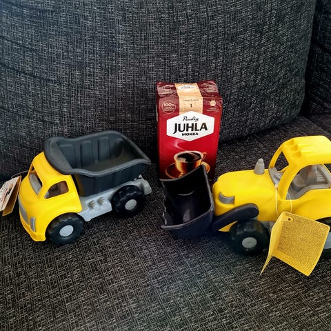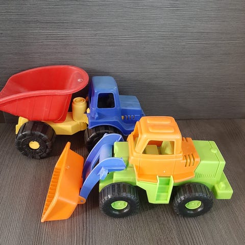 Traktori ja kuorma-auto, ehjät ja siistit, molemmissa pintakulumaa.