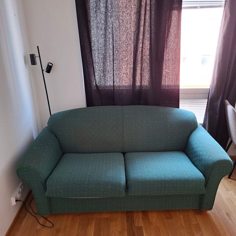 Hyvässä kunnossa, levitettävä sohvasänky. 2 aluslaatikkoa.