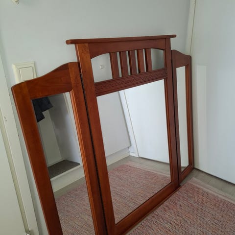 Vanhan näköiseksi tehty peili. Peilissä on edessä pieni taso. Takana kiinnityspaikat.