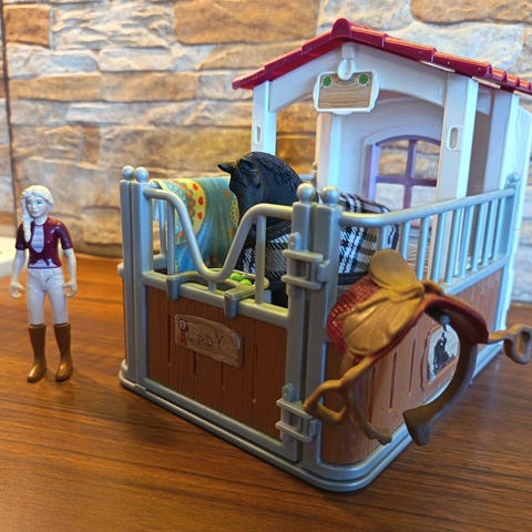 Schleich- setti, johon kuuluu valkoinen hevonen, hoitaja-figuuri sekä pesupaikka. Mukana on ämpäri, harjapakki ym. kuvassa näkyvät.