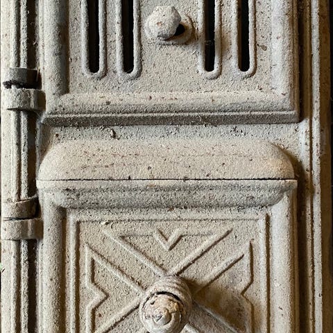 Valurautainen uuninluukku, jossa kaareva muoto ja ilmanvaihtoaukot. Luukussa on valettu keskelle ympyrän muotoinen merkki. Sopii esimerkiksi varaosaksi tai kunnostettavaksi vanhaan uuniin tai takkaan. Mitat näkyvät kuvissa mittanauhan avulla. Luukku on metallia ja siinä on käytön ja iän mukaisia jälkiä sekä pintaruostetta.