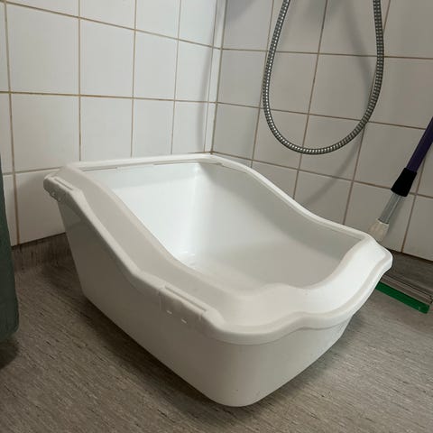 Valkoinen kissan kuution muotoinen säilytyskaappi, jonka etuseinään on tehty pyöreä kulkuaukko. Soveltuu kissan vessan piilotukseen ihmiskatseilta, tai vaikka piilopaikaksi, jos ei muovista kissanvessaa päätäkkään laittaa kaappiin. Mukaan saa muovisen kissanvessan, joka mahtuu tämän sisälle.