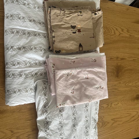 Myytävänä Muumi ja Familon pussilakanat sekä aluslakanat,joista valkoinen lakana on H&M ja vaaleanpunaisesta lappu leikattu,joten valmistaja ei tiedossa.