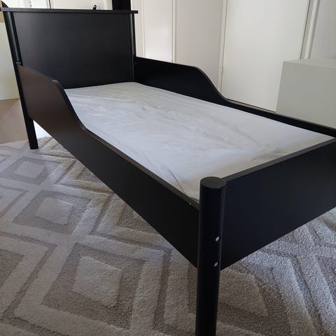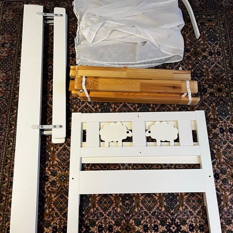 Ikea juniorisänky, jossa puinen sälepohja (Sultan Lade). Sängyn runko on valkoinen ja päädyssä on kuviolliset aukot. Sopii lapselle juniorikokoiseen patjaan. Materiaalina puu ja maalattu runko. Sänky soveltuu lastenhuoneeseen siirtymävaiheen sängyksi pinnasängyn ja täysikokoisen sängyn väliin.