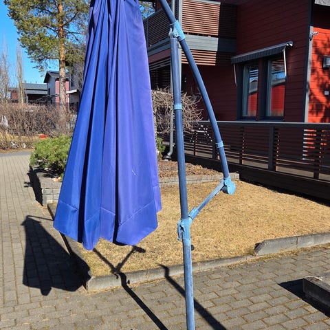 Markiisi, jossa vihreä–valkoinen raidallinen kangas. Soveltuu terassin tai parvekkeen varjostukseen ja auringonsuojaksi. Kangas kiinnitetty seinään asennettavaan runkoon. Markiisi rullautuu, mikä suojaa kangasta, kun sitä ei käytetä. Kangas on kulunut osittain, mutta rullalla ollut osio paremmassa kunnossa. Kankaan voi vaihtaa. Mekanismi hyväkuntoinen. Mitat: leveys 4,30m, syvyys noin 3m. Kuljetus vaatii omat kantajat ja mahdollisesti peräkärryn.