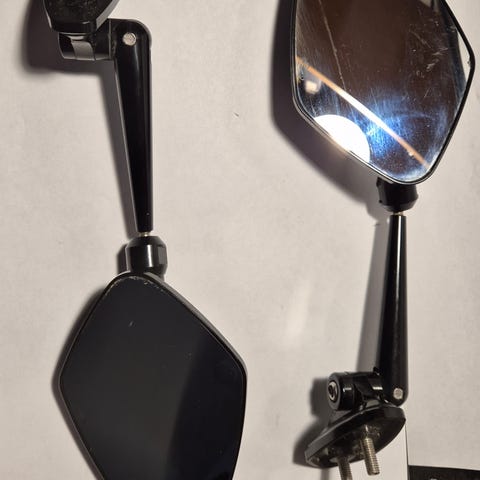 Moottoripyörän peilit, pyöreät ja krominväriset. Peileissä suora varsi ja kumisuojatut päät. Sopivat yleiskäyttöön moottoripyörän taustapeileiksi, kun kiinnitystapa ja koko vastaavat omaa ajoneuvoa.