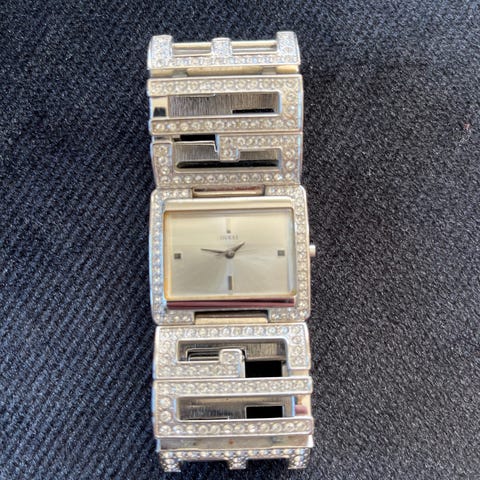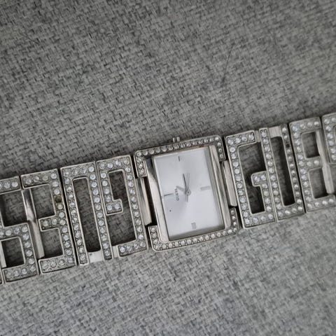 Guess naisten rannekello hopeanvärisellä teräsrungolla ja -rannekkeella. Kellossa on suorakaiteen muotoinen kellotaulu, jossa on metallinhohtoinen vaalea tausta ja pienet indeksimerkinnät. Ranneke on leveä linkkiranneke, jossa koristekuviointi ja taittosolki. Koneistona kvartsikoneisto, takakannessa Guess-logo ja mallimerkinnät. Sopii naisille arki- ja juhlakäyttöön. Pituus 16cm.