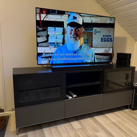 IKEA tv-taso, jossa kolme lasihyllyä ja metalliset jalat. Pöydän muoto on kulmaan sopiva. Ylätaso soveltuu televisiolle ja alemmat tasot esimerkiksi medialaitteille tai säilytykseen. Materiaalina kirkas lasi ja harmaa/metallinen runko.