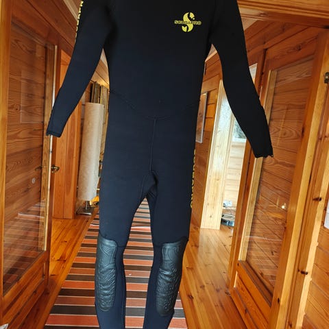 Seemann märkäpuku ja erillinen liivi. Kokopuku pitkällä lahkeella ja hihalla, takavetoketjulla. Liivi on hihaton ja siinä on huppu sekä etuvetoketju. Materiaalina joustava neopreeni, väri musta ja harmaa. Käytetty sukellukseen ja pärjää hienosti 4C vedessä ainakin 30min.