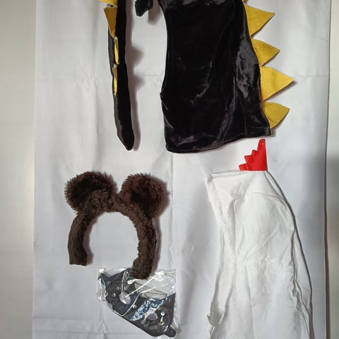 Puku on oranssi-mustaraidallinen, vatsan alue pörröinen. Asuun kuuluu irrallinen päähine. Takana pitkä häntä. Tarranauhalla saa selän puolelta kiinni.