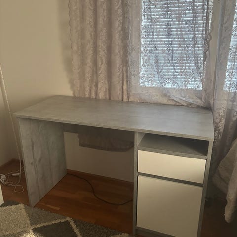 Jysk Pöydässä on suorakaiteen muotoinen kansi ja sivulla avohylly sekä laatikollinen säilytystila. Väri on vaalea, pääosin valkoinen. Sopii esimerkiksi työ- tai opiskelupöydäksi kotiin.