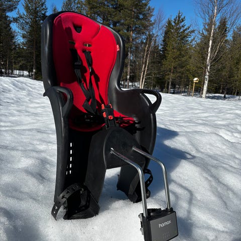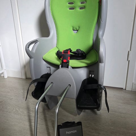 Hamax Caress C3 lastenistuin pyörään. Kunto hyvä. Kiinnityspalat kahteen pyörään, toisessa kumiosa irronnut mutta toimivia. Sadeviitta mukaan. Nouto Karvonrannasta.