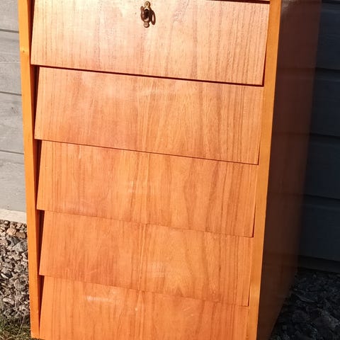 vintage-tyylinen kirjahylly/vitriinikaapisto, todennäköisesti 1960–80-luvulta.