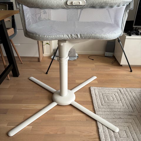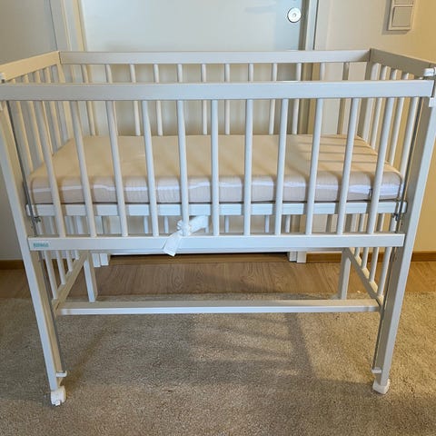 Jollyroom sivuvaunusänky, väri valkoinen. Sänky kiinnitetään vanhemman sängyn viereen, jolloin vauva nukkuu omassa sängyssään mutta lähellä aikuista. Sängyssä on laidalliset sivut ja avoin puoli vanhemman sänkyyn päin. Materiaalina maalattu puu. Soveltuu vastasyntyneestä noin puolivuotiaaksi. Kuvissa näkyy myös patja ja kiinnitysmekanismi vanhemman sänkyyn. Mukana sänkyyn sopiva patja. Sänky purettu osiin. Vain nouto Niemenrannasta.