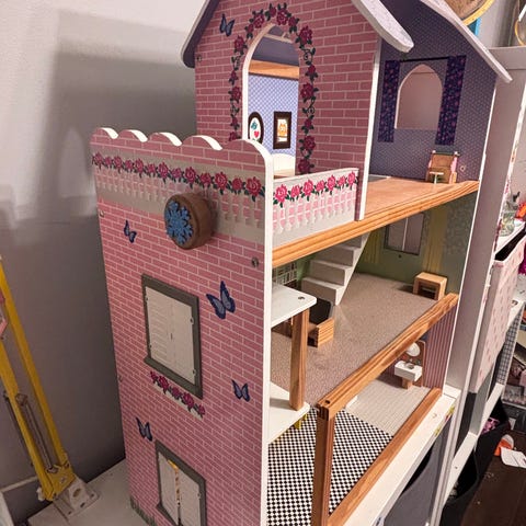 Puinen vaaleanpunainen/mintun värinen koti. On siisti. Leveys 70cm ja korkeus 60cm.