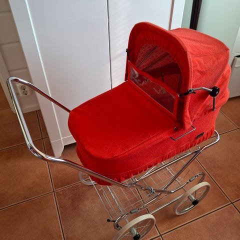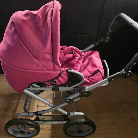 BRIO nukenvaunut sinisellä kankaalla ja valkoisella rungolla. Vaunuissa on kiinteä koppa, kuomu ja alakorissa säilytyskori, jonka saa irti. Neljä pyörää, etupyörät kääntyvät. Työntöaisa on säädettävä. Todella kauniissa kunnossa. Kankaat ehjät ja siistit, mutta etuosassa on jotain valkoista, mikä ei lähtenyt saippualla ja kostealla pyyhkimällä. Ehkä seinämaalia. Katsothan kuvista tarkemmin, vaikka luonnossa eivät korostukaan noin selvästi.