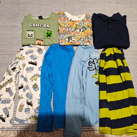 Myydään poikien vaatepaketti, koko 134, värit pääasiassa musta ja harmaa. 4 pitkähihaista, aiheita mm. PlayStation, New York. Kaksi paidoista käytetympiä, kaksi taitaa olla käyttämättömiä.