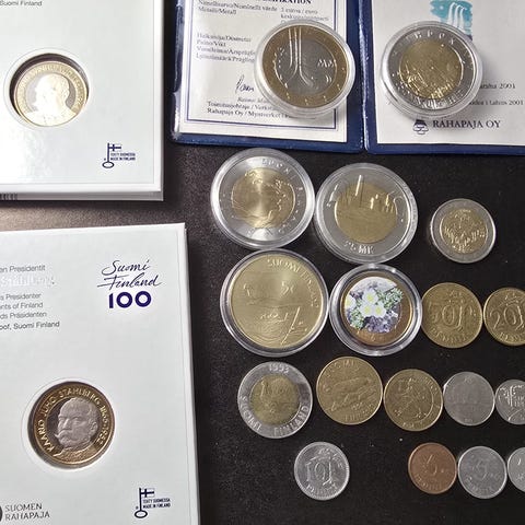 - Suomen itsenäisyyden 90-vuotis juhlaraha vuodelta 2007. Halkaisija 35 mm.
